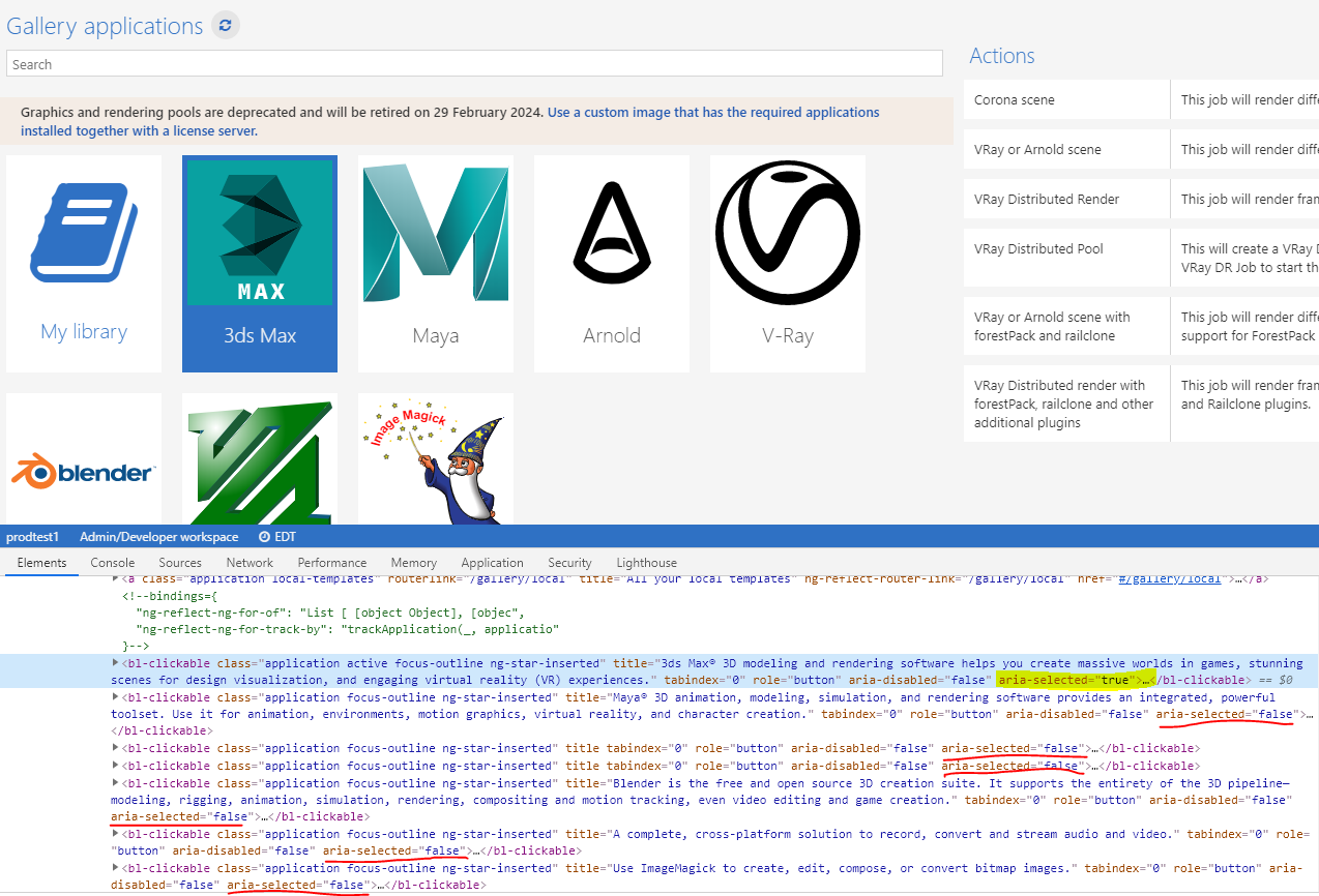 This screenshot displays how the aria-selected tag for the 3ds Max button is set to 'true' (because the user has selected that button), whereas for all other buttons on the page, the tag is set to 'false.'