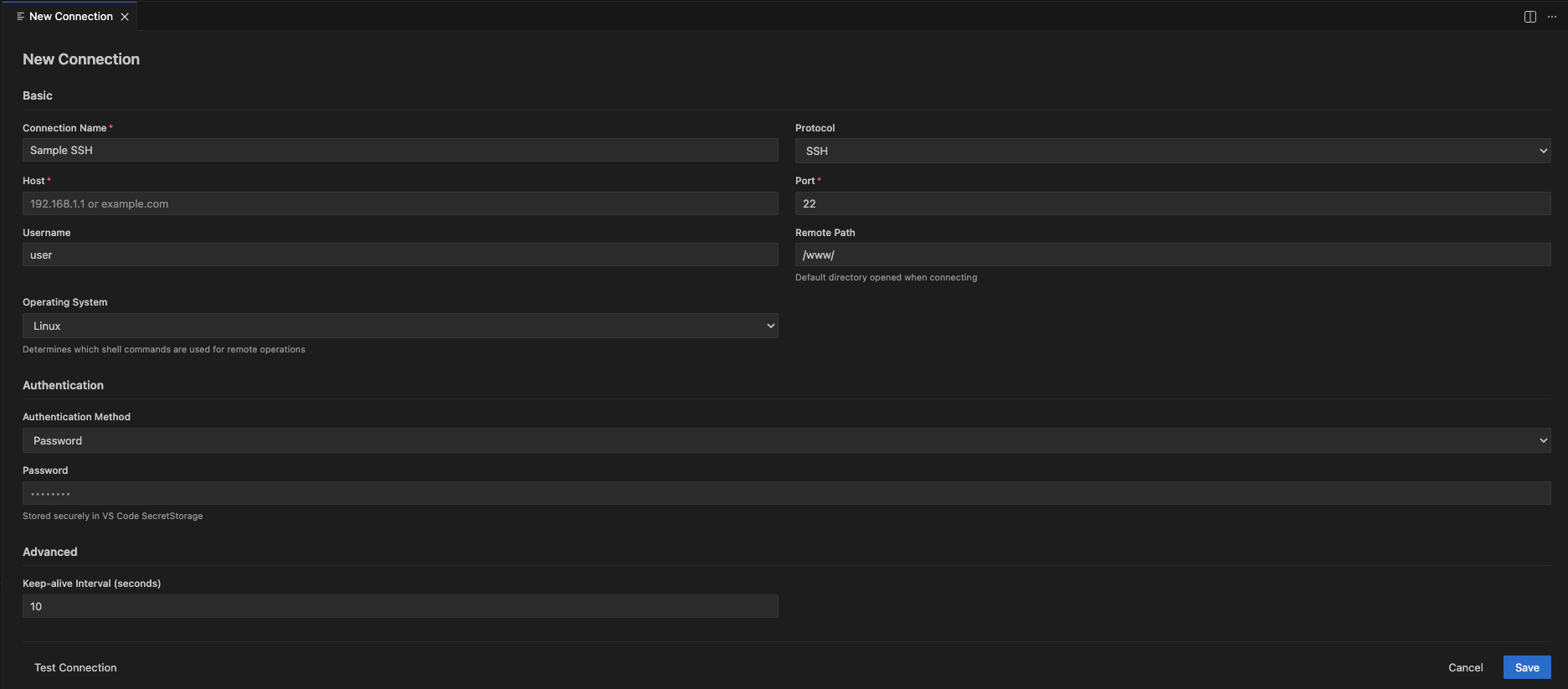 When adding or editing a connection, you'll see a form with these sections: