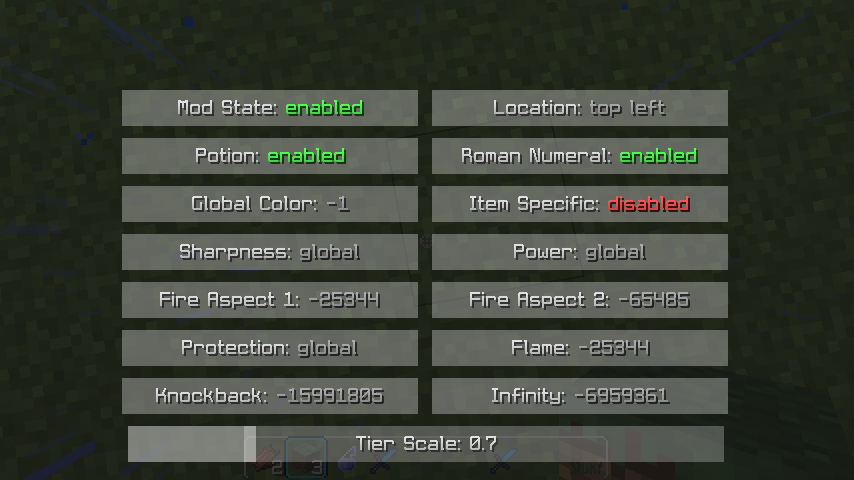 Can you do numbers instead of Roman Numeral? | In the future I plan to make a GUI to config to your likings. (Added configs in 1.5)Why does the text get cut off? | Because the text renders behind the item, and I don't want to use override anything because mod conflicts can happen. (Fixed in 1.1)- What does the colors mean? | Orange for fire aspect 1 and flame (it only has one level) and red for fire aspect 2 (In 1.5 you can change the colors)