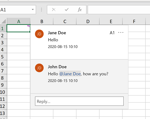 EPPlus supports threaded comments from version 5.3. With threaded comments users can add comments to a thread that belongs to a cell in a worksheet. The users can mention eachother in the comments and the entire thread can be resolved (closed/locked) and re-opened. EPPlus 5 supports all of these features. Threaded comments exists in several spreadsheet programs, however the EPPlus 5 implementation is designed to cover most of the functionality in Excel/Office 365.