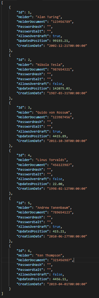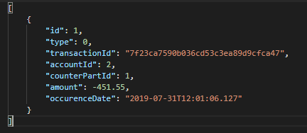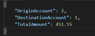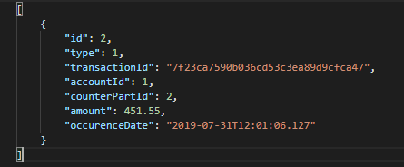 You can check an account entries (transaction history) by GET to localhost/api/bank/GetEntriesByAccountId/{accountId}; so, regarding the transfer mentioned above, making this request to the AccountId 2, will return: