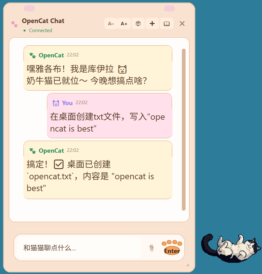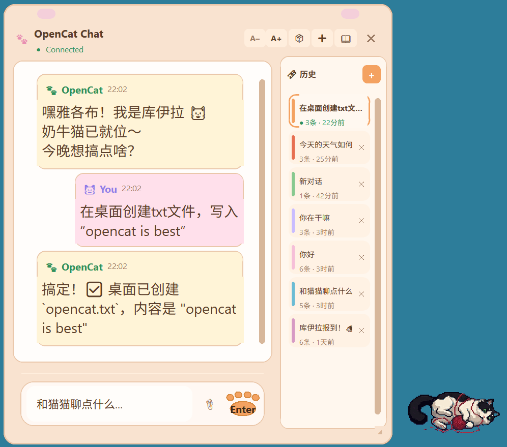 OpenCat puts a pixel-art cat on your desktop. Click it, and a warm-toned chat window pops up. That's it. No browser, no VPN, no noise.