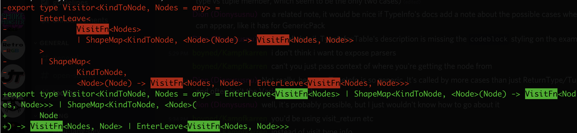 with 0.12.2: <img width="1123" alt="image" src="https://user-images.githubusercontent.com/1550766/154002549-90fd93cd-eb2e-4574-8651-4d8931594329.png"> ```lua export type Visitor<KindToNode, Nodes = any> = EnterLeave< VisitFn<Nodes> | ShapeMap<KindToNode, <Node>(Node) -> VisitFn<Nodes, Node>> > | ShapeMap< KindToNode, <Node>(Node) -> VisitFn<Nodes, Node> | EnterLeave<VisitFn<Nodes, Node>>> ```