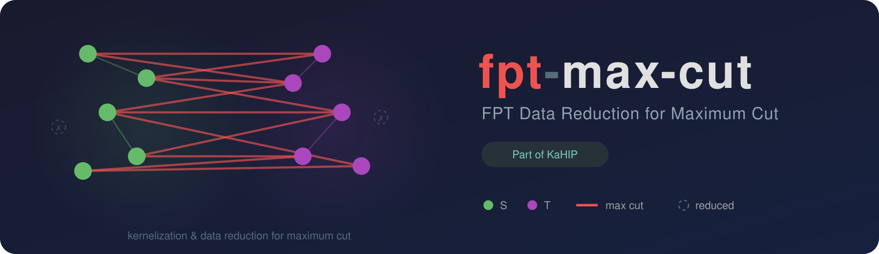 fpt-max-cut implements FPT-based data reduction rules (kernelization) for the maximum cut problem on undirected graphs. Given a graph, the maximum cut problem asks for a partition of the vertices into two sets such that the total weight of edges between the sets is maximized. Part of the KaHIP organization.