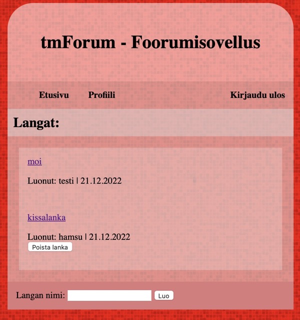 tmForum Foorumisovellus PHP:lla Docker Sovelluspinon voi käynnistää helposti Dockerin avulla. $ docker compose up