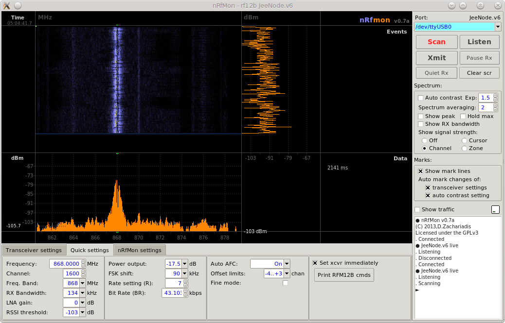- A TCL script that runs on a PC and connects the Arduino + RFM12B with the PC, presenting the user with a waterfall and spectrum plot of the frequency band in use.