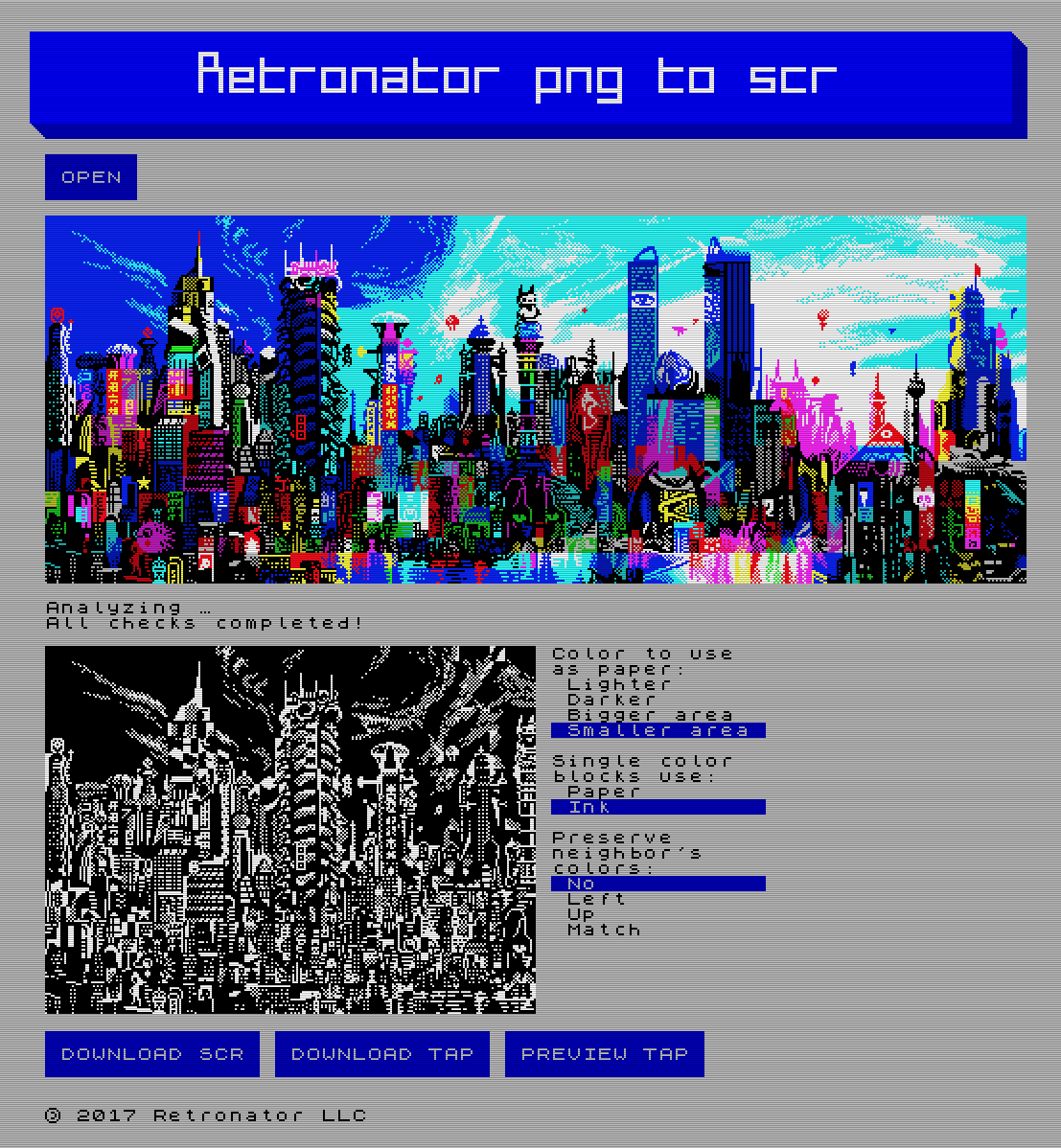 PNG to SCR is a tool for artists that create ZX Spectrum artworks in the usual (pixel art) graphics software such as Photoshop, GIMP, Aseprite, Pixaki etc.