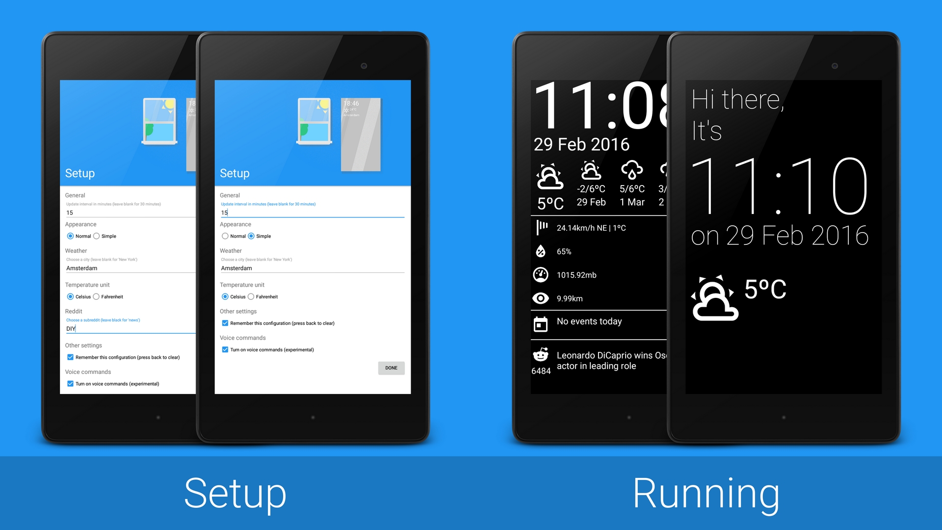 </resources>When you've turned on the voice command option in the setup screen you can talk to your device and make it update the data. To do this wake the device up by saying hello magic mirror, the device will then respond with hello there, how can I help you?. You can then speak commands, for example: say update and the data will refresh, if you don't say anything for a minute the device will go back to sleep by itself, you can also force this by saying go to sleep. There are also some other built in commands like tell me a joke which tells you a joke and show my location which pulls up a maps view of your home (if you did all the steps in the tutorial above). A small demonstration of the concept can be found below.