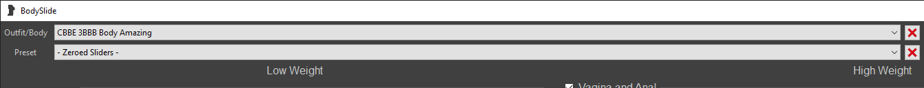 Step 1: In the Outfit/Body dropdown, find and select CBBE 3BBB Body Amazing. In the Preset dropdown, find and select - Zeroed Sliders -.