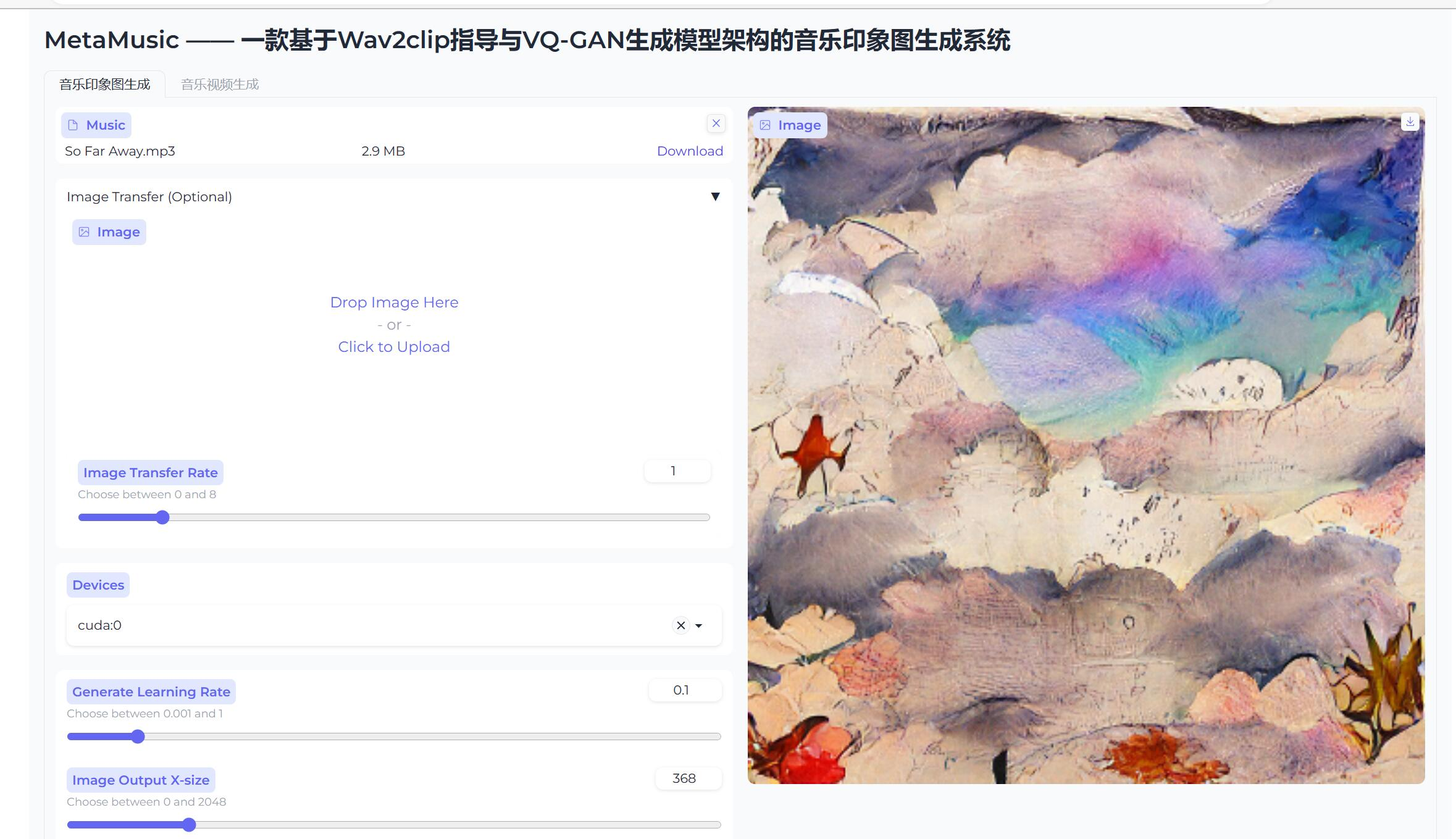 [×]已经尝试过接入 AudioClip 模型,由于训练数据集过于贴近现实的声音识别,对音乐效果不佳[×]已经尝试过接入其他 VQ-GAN 模型,由于 ImageNet 数据集过于写实的缘故,并不是很贴近于歌曲情感图像绘制,效果不佳[×]已经尝试过对整个项目实现 CLIP-guided Diffusion 模型改造,但是由于视频生成效率过低,导致视频生成时间大大增加,视频模块采用过大模型逐帧生成的方案暂时被搁置[√]对代码进行兼容性改造,并对部分模型进行混合精度运算降低显存占用[√]将两套系统成功封装为 API,可以实现简易调用[√]实现 gradio 的可视化界面[ ]尝试自己整理数据集训练 Wav2Clip 模型(或可能 VQ-GAN)[ ]继续尝试其他包括但不限于 Diffusion 架构的图像生成模型,接入 MetaMusic 印象图生成模块
