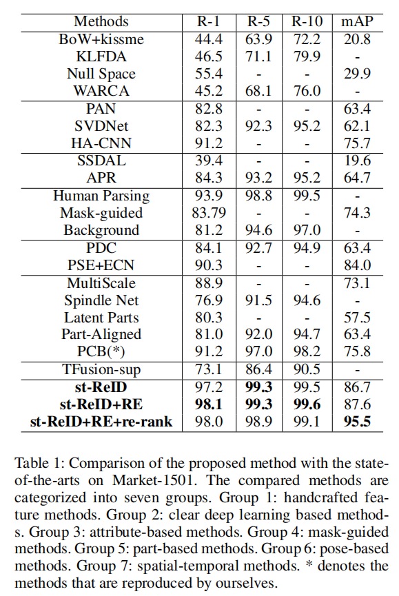 Code for st-ReID(pytorch). We achieve Rank@1=98.1%, mAP=87.6% without re-ranking and Rank@1=98.0%, mAP=95.5% with re-ranking for market1501.For Duke-MTMC, we achieve Rank@1=94.4%, mAP=83.9% without re-ranking and Rank@1=94.5%, mAP=92.7% with re-ranking.