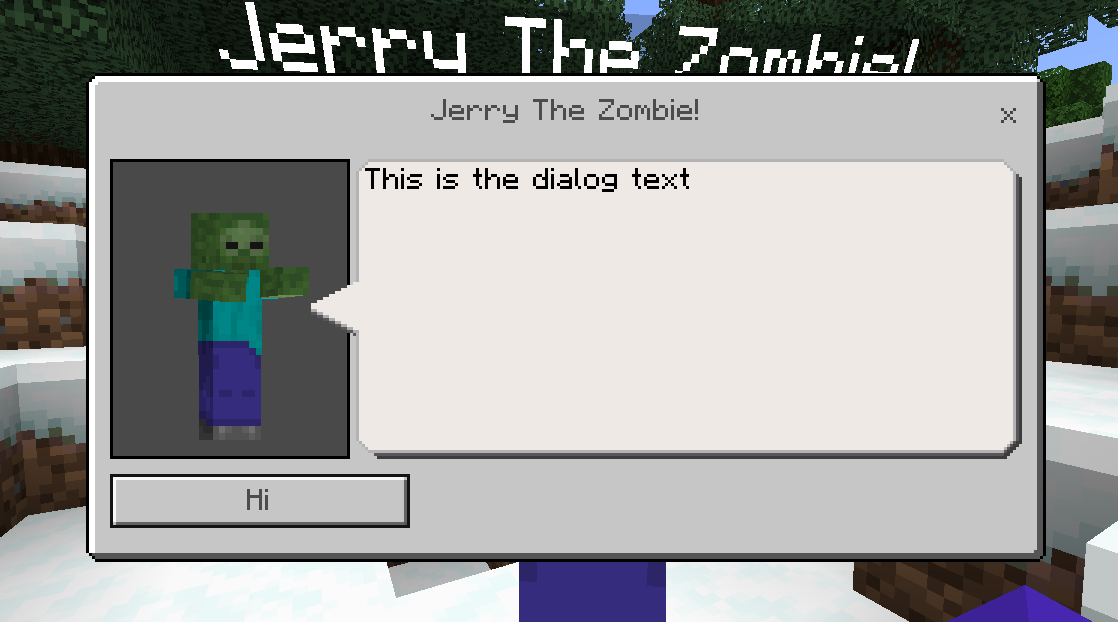 (new DialogForm("This is the dialog text", function(Player $player){ $player->sendMessage("You opened the form!"); }, function(Player $player){ $player->sendMessage("You closed the form!"); }))->addButton("Hi", "say Hii!!", function(Player $player){ $player->sendMessage("Hi!!"); })->pairWithEntity($entity);The result of this example would be an entity showing this when it's right-clicked (or hold in the mobile versions):