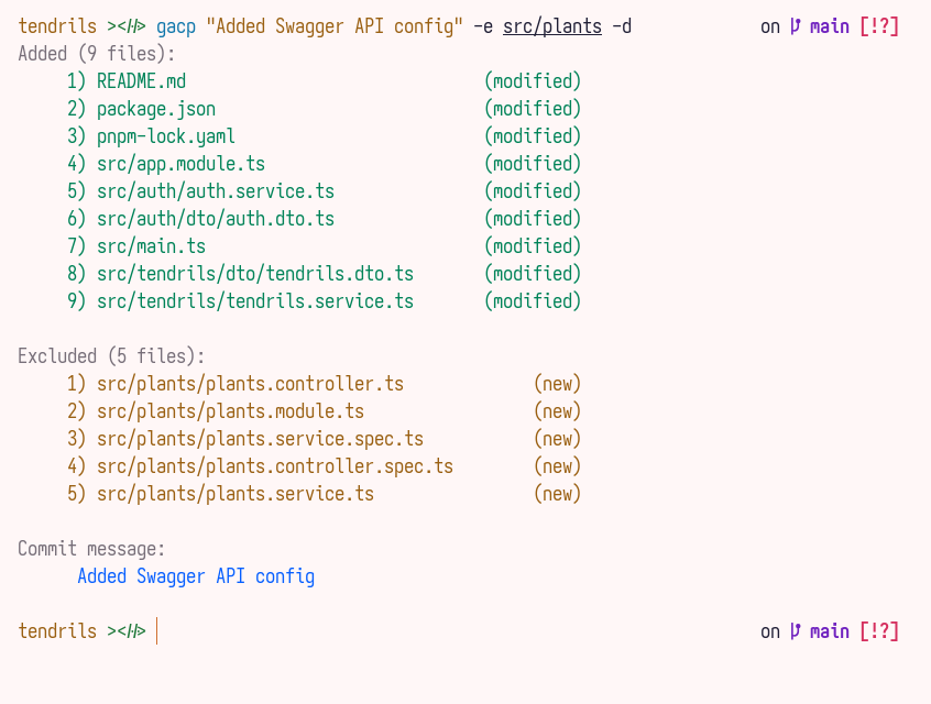 export GACP_DEFAULT_MESSAGE="My default git commit message"To add files to exclude automatically (like .gitignore), create ~/.config/gacp/gacp.exclude file