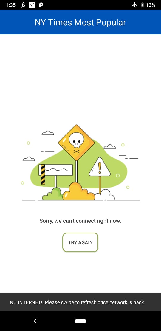 Newyork Times Android App Sample App for Implementation of new times Most Popular API Below components has been used: MVVM pattern Picasso Retrofit Screenshots