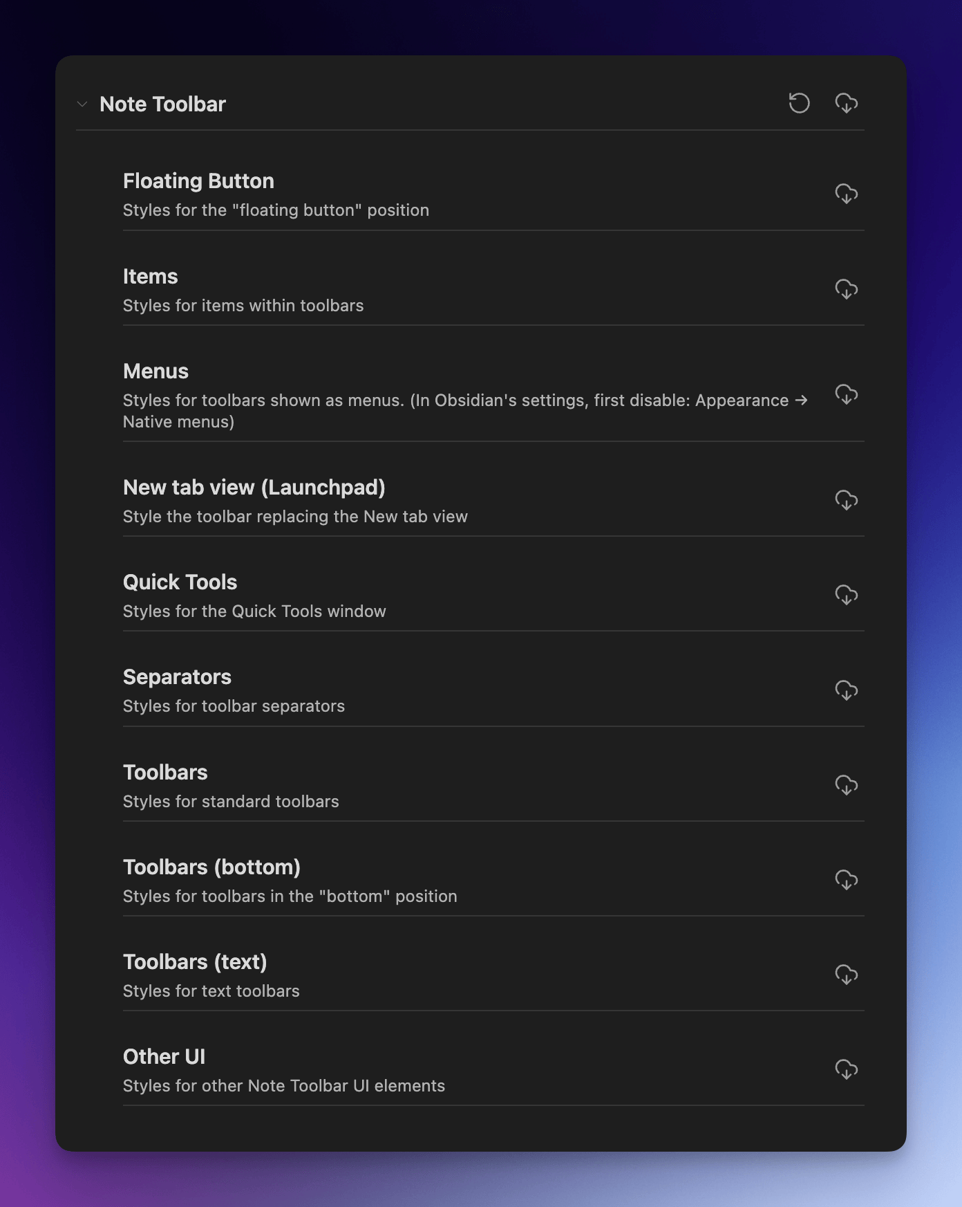 - To be able to style menus, make sure this setting is disabled in Obsidian's settings: Appearance → Advanced → Native menus