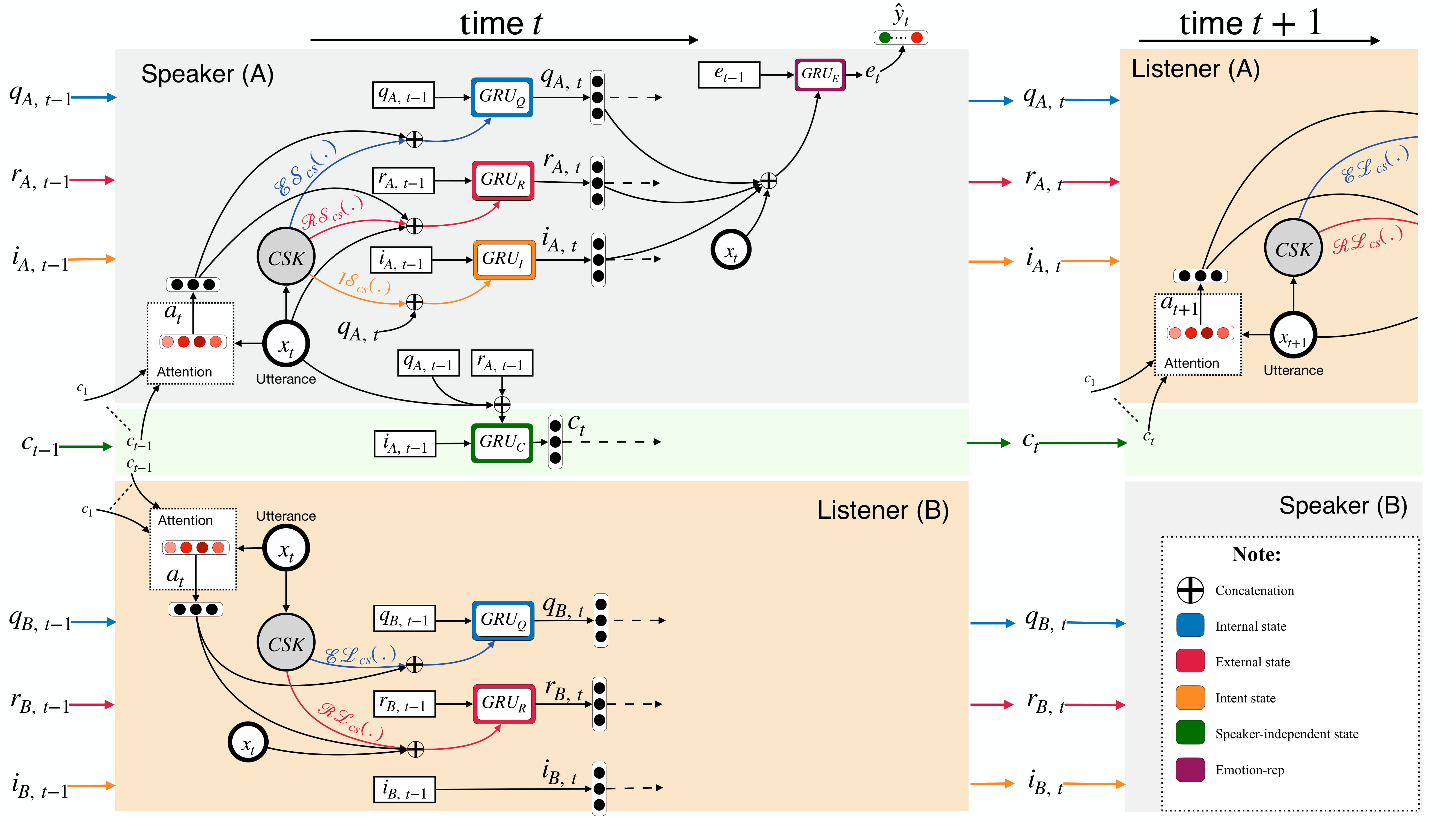 DialogueRNN: An Attentive RNN for Emotion Detection in Conversations. N. Majumder, S. Poria, D. Hazarika, R. Mihalcea, E. Cambria, and G. Alexander. AAAI (2019), Honolulu, Hawaii, USAInteractive COnversational memory Network (ICON) is a multimodal emotion detection framework that extracts multimodal features from conversational videos and hierarchically models the \textit{self-} and \textit{inter-speaker} emotional influences into global memories. Such memories generate contextual summaries which aid in predicting the emotional orientation of utterance-videos.
