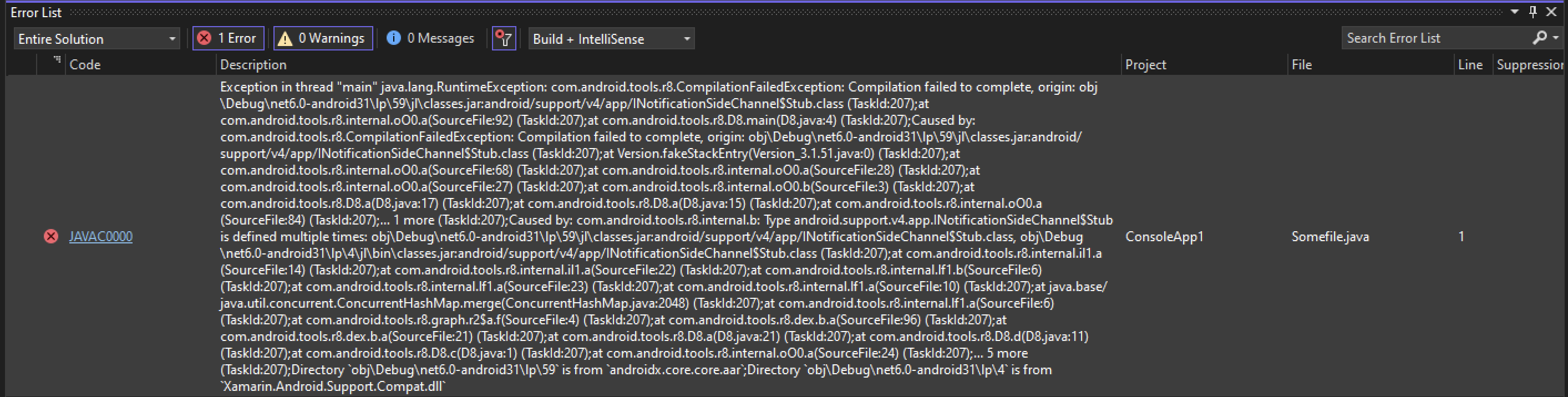 error JAVA0000: Exception in thread "main" java.lang.RuntimeException: com.android.tools.r8.CompilationFailedException: Compilation failed to complete, origin: obj/Debug/net7.0-android/lp/59/jl/classes.jar:android/support/v4/app/INotificationSideChannel$Stub.class