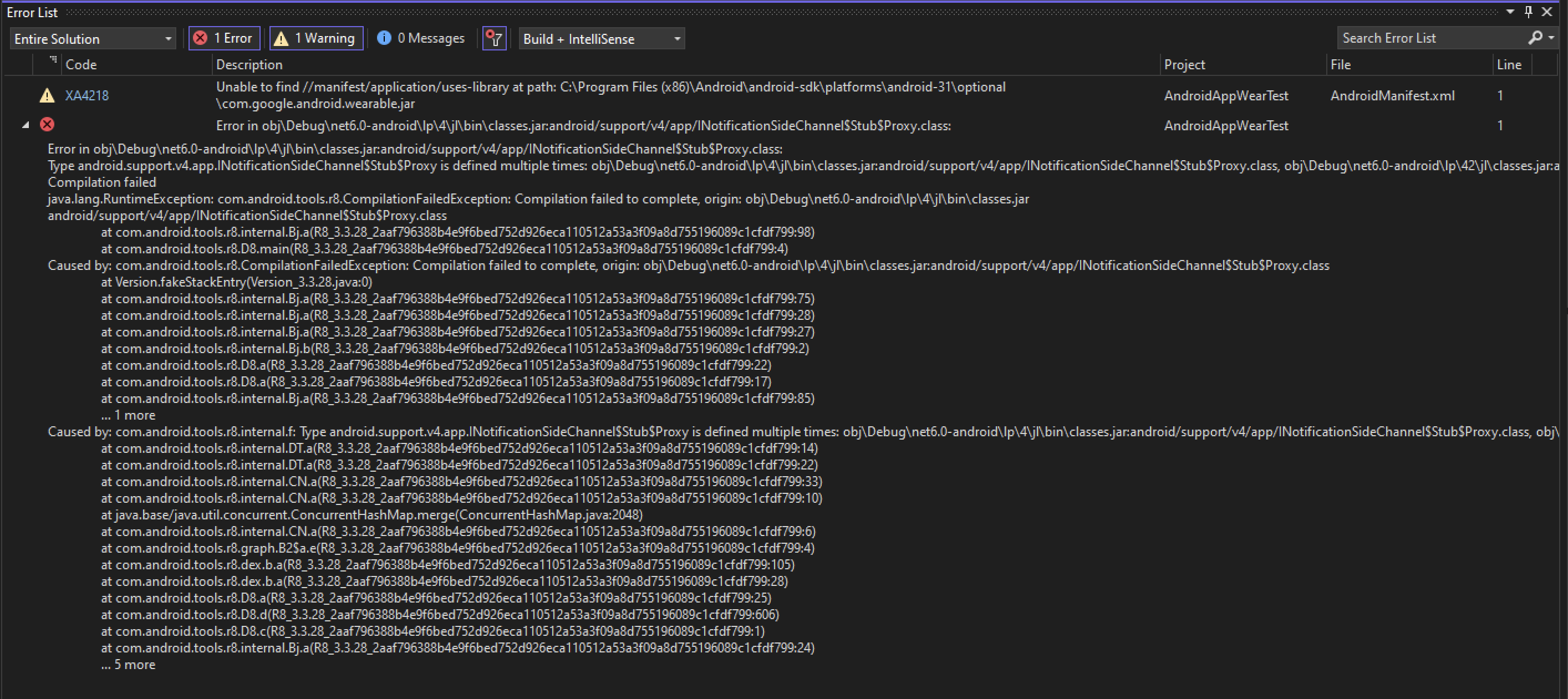 Exception in thread "main" java.lang.RuntimeException: com.android.tools.r8.CompilationFailedException: Compilation failed to complete, origin: obj/Debug/net7.0-android/lp/59/jl/classes.jar:android/support/v4/app/INotificationSideChannel$Stub.class
