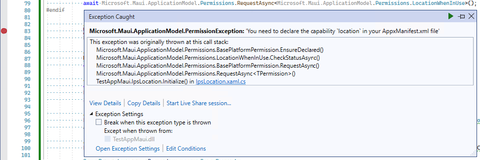await Microsoft.Maui.ApplicationModel.Permissions.RequestAsync<Microsoft.Maui.ApplicationModel.Permissions.LocationWhenInUse>(); - Run on windows.