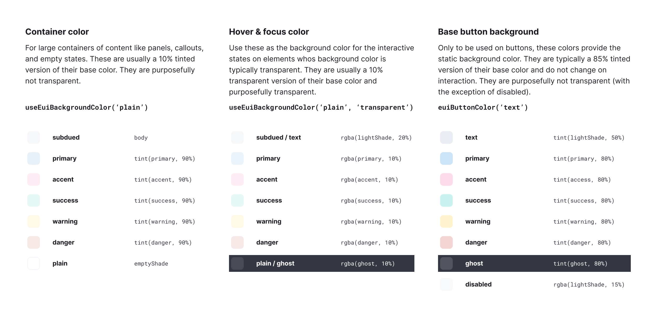 BUTTON_COLORS,useEuiButtonColorCSS(), andeuiButtonColor()Updated the colors / contrast section to show all three types of background colors: