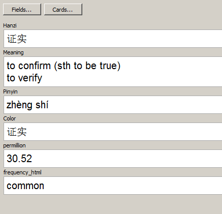 This will go through the decks you have now and fill in two new fields, permillion (frequency of this word appearing per million words in a chinese internet corpus), and frequency_html which is just text describing how frequent the word is from: