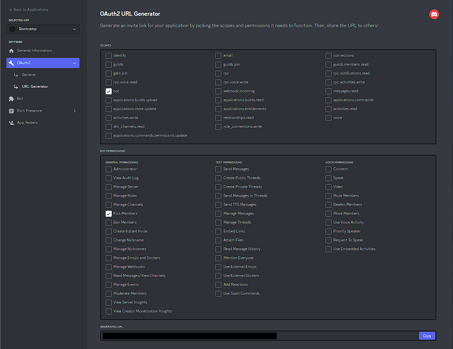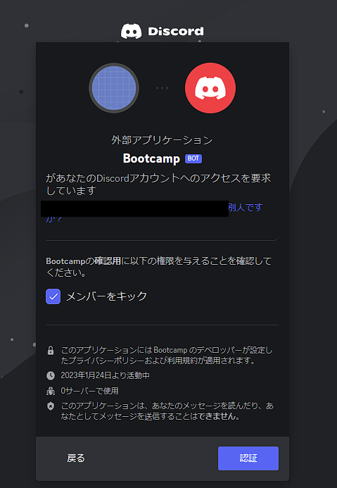 Authorization Flow > PUBLIC BOTのトグルボタンを OFF にしますPrivileged Gateway Intents > SERVER MEMBERS INTENTのトグルボタンを ON にしますボタン「認証」をクリックして画面の指示に従えばOKです。