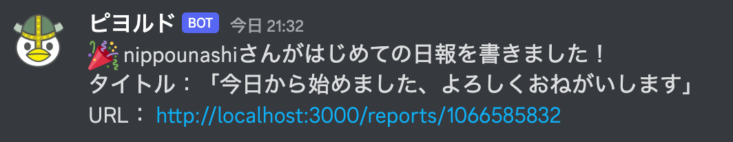 DISCORD_INTRODUCTION_WEBHOOK_URLに設定しないと通知が行われません。feature/post-first-report-submission-to-the-discord-introduction-channelをローカルに取り込むDISCORD_INTRODUCTION_WEBHOOK_URL=<ウェブフックのURL> rails sでローカル環境を立ち上げますnippounashiでログインしますScreenshot