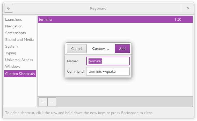 Configuring this hot key for GNOME is quite simple, simply open the Keyboard settings and configure a hot key as per the example in the screenshot below: