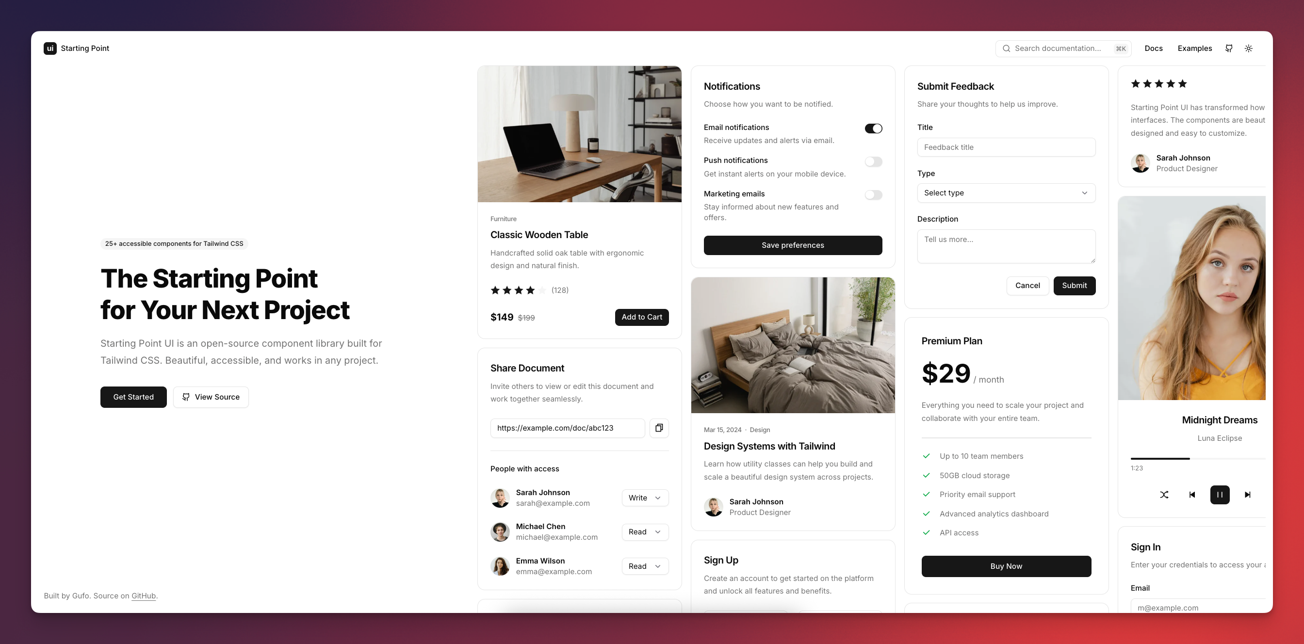 An open-source component library for Tailwind CSS. Inspired by shadcn/ui, Starting Point UI gives you the same beautiful design system without locking you into a framework. React, Vue, Angular, Django, Laravel, Rails, plain HTML - if it runs Tailwind, it works.