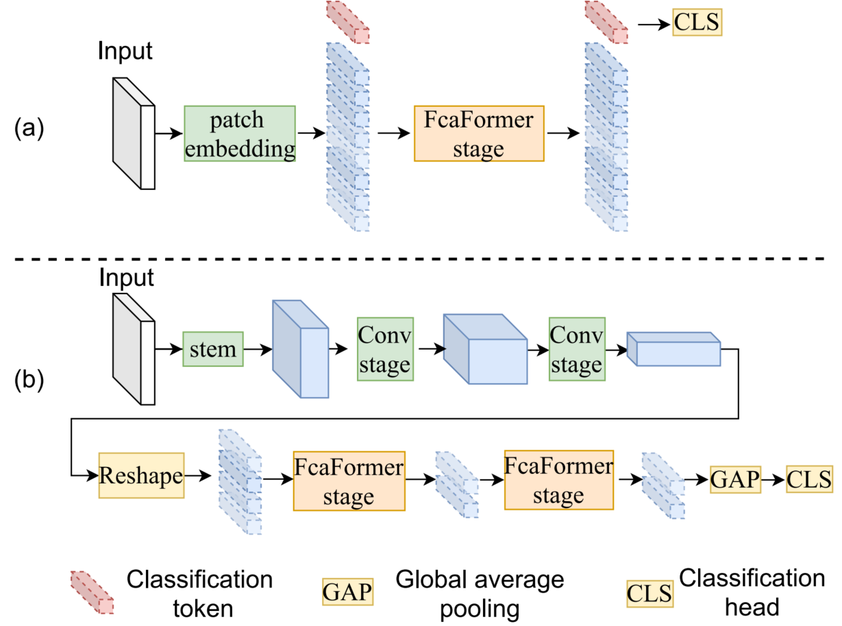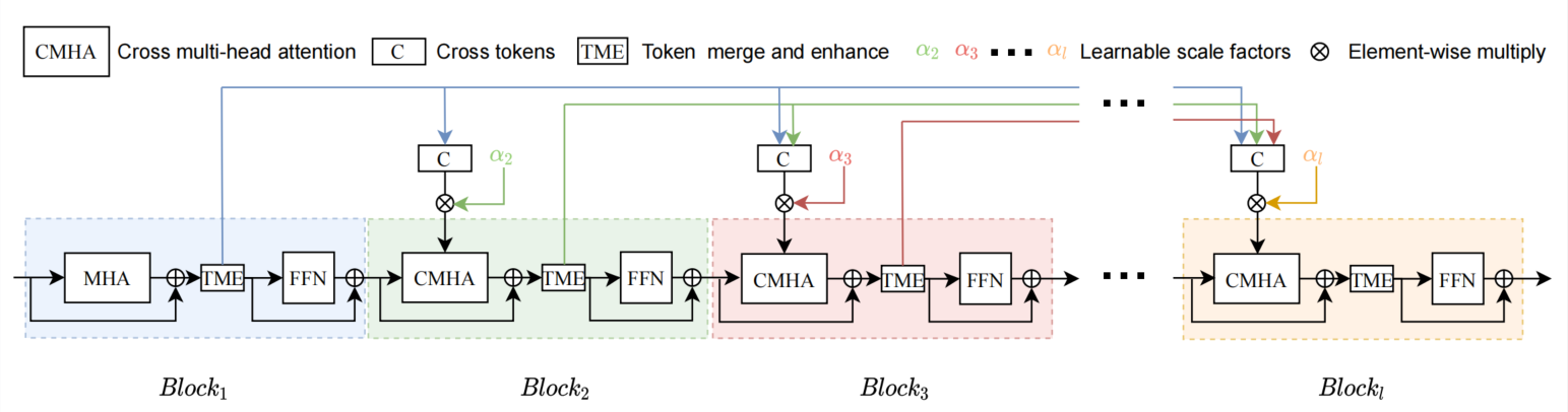 A FcaFormer stage which consists of L FcaFormer blocks. Compared with standard ViT blocks, we add token merge and enhancement (TME) part, which uses long stride large kernel convolutions to merge tokens spatially as cross tokens, and small kernel convolutions to further enhance tokens for channel mixing (FFN). The cross tokens are then used in later blocks as extra tokens for multi-head attention, after being calibrated by multiplying them with learned scaling factors. The overall structure of FcaFormer Mobels for image classification tasks. (a) Plain FcaFormer model. This model is directly modified from the DeiT structure. (b) Hybrid FcaFormer model. The ConvNet stages are composed of ConvNext blocks.Currently, one main research line in designing a more efficient vision transformer is reducing the computational cost of self attention modules by adopting sparse attention or using local attention windows. In contrast, we propose a different approach that aims to improve the performance of transformer-based architectures by densifying the attention pattern. Specifically, we proposed forward cross attention for hybrid vision transformer (FcaFormer), where tokens from previous blocks in the same stage are secondary used. To achieve this, the FcaFormer leverages two innovative components: learnable scale factors (LSFs) and a token merge and enhancement module (TME). The LSFs enable efficient processing of cross tokens, while the TME generates representative cross tokens. By integrating these components, the proposed FcaFormer enhances the interactions of tokens across blocks with potentially different semantics, and encourages more information flows to the lower levels. Based on the forward cross attention (Fca), we have designed a series of FcaFormer models that achieve the best trade-off between model size, computational cost, memory cost, and accuracy. For example, without the need for knowledge distillation to strengthen training, our FcaFormer achieves 83.1% top-1 accuracy on Imagenet with only 16.3 million parameters and about 3.6 billion MACs. This saves almost half of the parameters and a few computational costs while achieving 0.7% higher accuracy compared to distilled EfficientFormer.