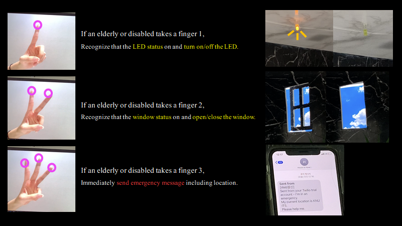 The elderly and disabled can face many difficult situations when they are home alone. Family may not be able to stay with them 24 hours a day. In the face of an aging society where the number of elderly people is increasing, welfare environments for the elderly and the disabled should be provided. Therefore, we have developed a system that allows them to operate functionality in their house with simple hand movements and to escape from emergency situations.