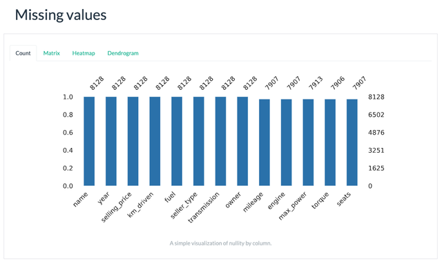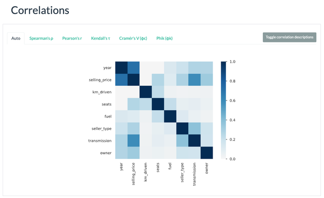 This section shows correlations between different columns. As we would expect, the strongest correlation is between year and selling price: