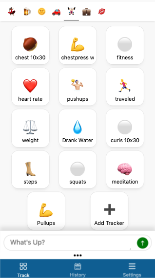 - Tracker - primarily represented by a button on the "track board". Trackers are represented by their hashtag in notes - for example: #sleep(160000).