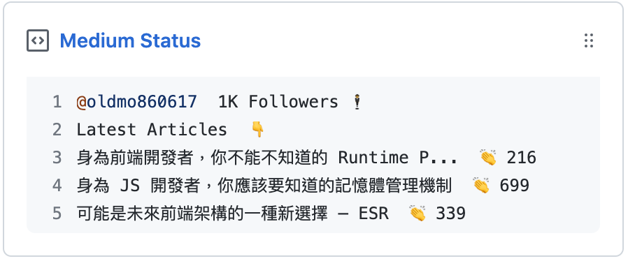 This project uses Medium RSS API to get personal profile data and uses cheerio to crawl more details such as follower count and claps of articles. The following details will be displayed in pinned gist:
