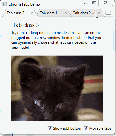 A tab control based on WPF chrome tabs, modified to work with the MVVM pattern. WPF chrome tabs is a tab control modeled after the tabs in Google's Chrome browser.