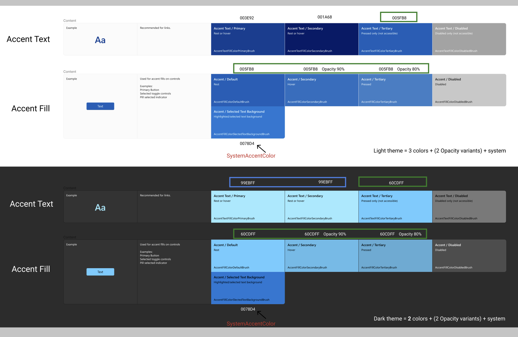 As far as I understand, the pure system brush is almost never used in the interface. Except for the AccentFillColorSelectedTextBackgroundBrush Microsoft creates three shades from SystemAccentColor for each theme and uses them. So ActiveBorder and ElementIcon must use AccentFillColorDefaultBrush like a button for example. I did a little comparison of the two colors in windows toolkit, please take a look. I've highlighted the same colors with a border, and as you can see, their order for AccentText is different for the two themes. That's why I suggested splitting the brushes into two theme files. Yes, Dark theme uses SystemAccentColorLight and Dark uses SystemAccentColorLight 🤯🤯🤯 Fun fact SystemAccentColorLight1 is never used... it's not even there. |