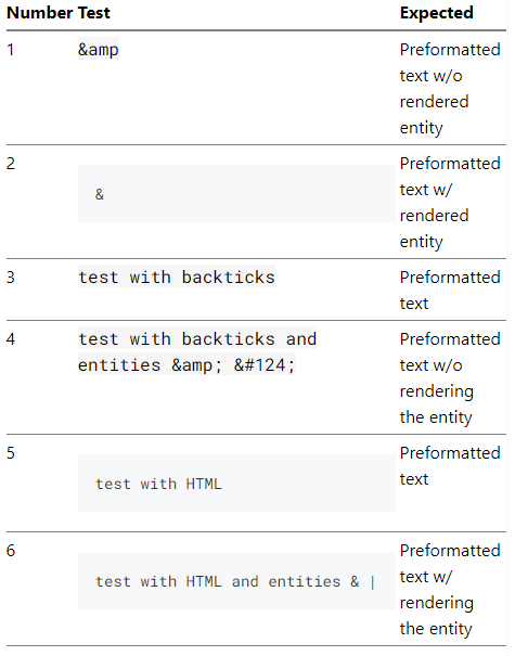 | 4 | `test with backticks and entities & |` | Preformatted text w/o rendering the entity |