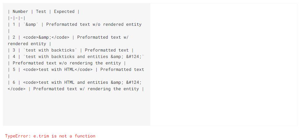 When I try to put an escaped HTML entity in a code block within a table, it throws an error. I ran across this when using Docusaurus and needed to use the pipe character in a code block in a table. When I try to use an escaped HTML entity in a code block in a table cell (i.e. <code>test with HTML and entities & |</code>) in the playground, it throws the error TypeError: e.trim is not a function.