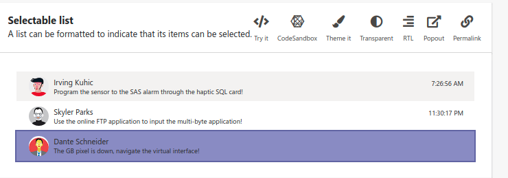 Create a List and navigate through the items with the keyboard, or hover over a ListItem with the mouse