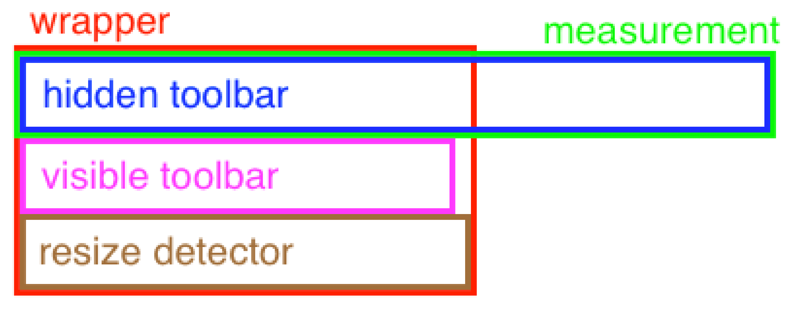 wrapperdiv.measurementdiv.measurementdiv, ahidden toolbaris renderedhidden toolbaris rendered, all its DOM children are measured and their rects are compared withwrapperrect to find out what overflows.onReduceItemscallback is called for the consumer to restructure the items, thehidden toolbaris re-rendered with the new items and the whole process repeatshidden toolbarfits thewrapper, current items are rendered tovisible toolbarandhidden toolbaris removedresize detectorinside thewrapperto detect width changes - if width changes,visible toolbaris not touched, but the whole process insidehidden toolbarstarts again with the initial (full) set of itemsPart of