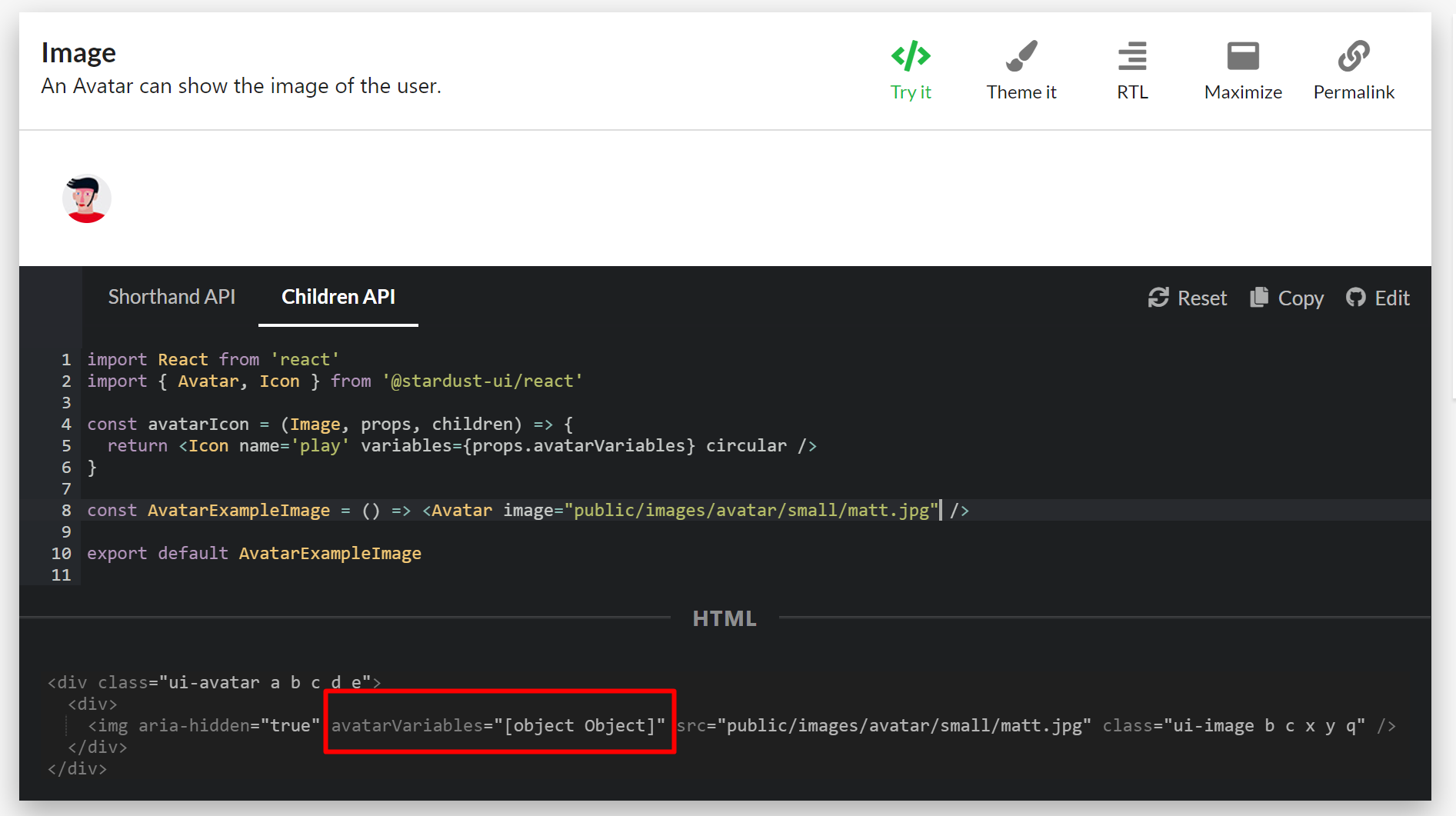 Hey guys, so, I tried using the shorthand for generating different element then the one specified and I tried adding some additional variables in the props that may be used in the shorthand method. Here is the example: The drawback of this is that, when the image shorthand is actually used as an image, this properties are sent to the HTML dom element, because those are not handled props... Is there any suggestion about how this should be addressed? Other then this, another thing that I have I am not much happy with, is that the props that I am receiving are for the image component, so if I want to actually get some prop, or the styles and variables for the Avatar component, I would still have to add them as some unhandled props for the Image component in order to have access to them. This will again end up with the problem I mention above. @levithomason @kuzhelov @miroslavstastny PS: I guess I can add all these additional properties just if the shorthand for the image is function. Maybe this would kind a solve this problem? |