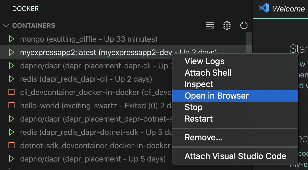 Open in Browsercommand to the context menu of running containers in the containers tree view.The command opens the browser to the first exposed port mapped to the host that likely represents a "web" endpoint. The heuristic works as follows: