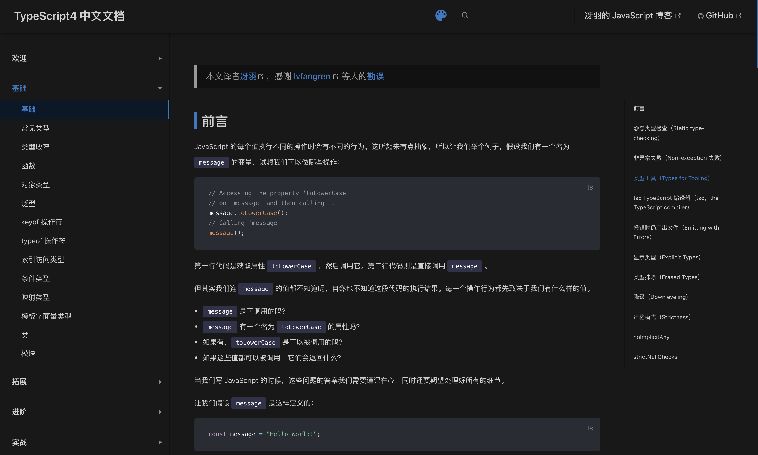 最近完成了 TypeScript 最新官方文档 Hanbook 的翻译,一共十四篇,堪称国内的最好 TypeScript4 入门教程之一。为了方便大家阅读,我用 VuePress + Github Pages 搭建了博客,博客效果如下: