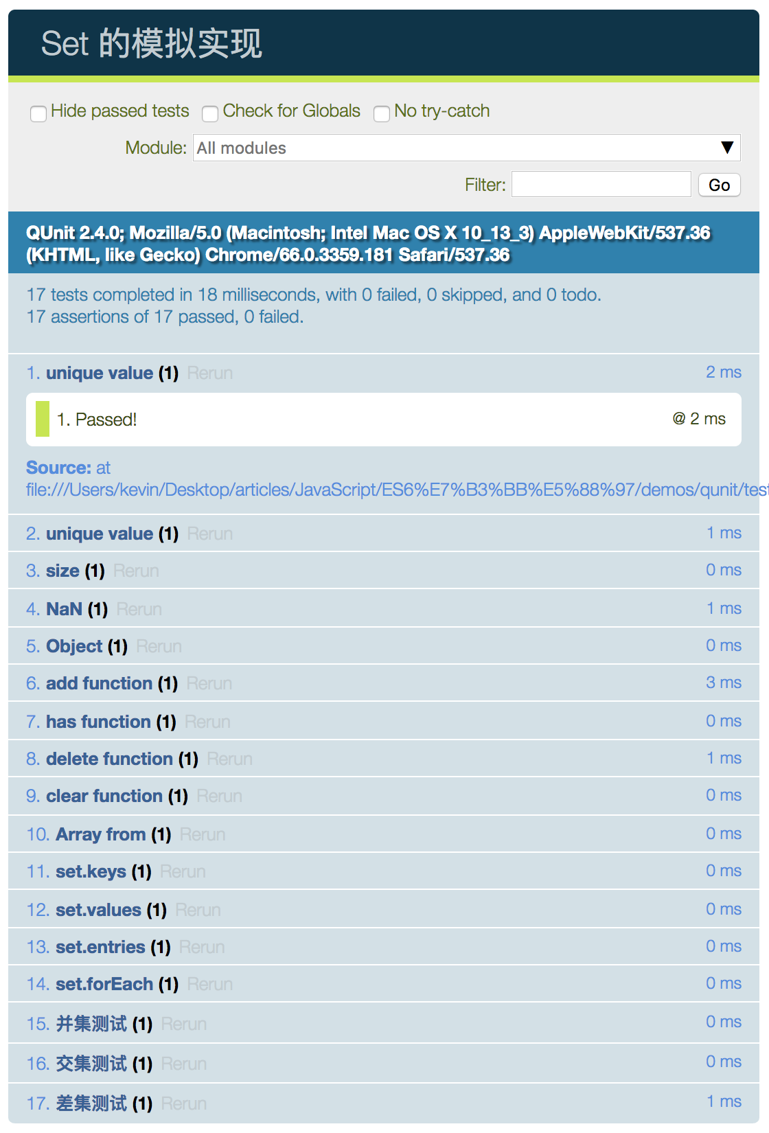 为了解决这个问题,针对模拟实现 Set 这样一个简单的场景,我们可以引入 QUnit 用于编写测试用例,我们新建一个 HTML 文件: