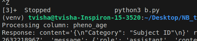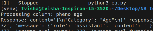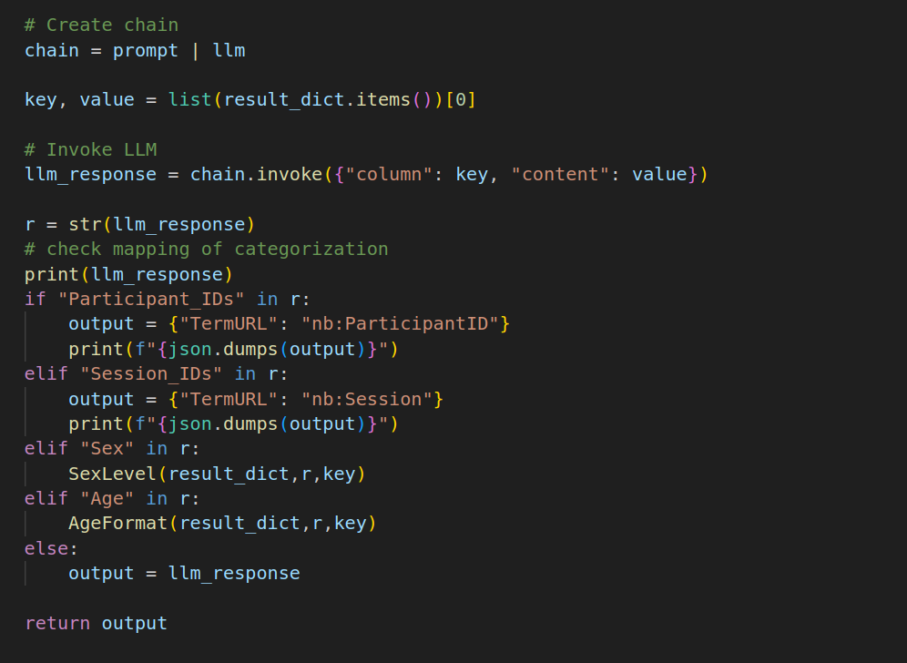 return resultsCategorization is carried out using LLMS and this step return the required structure of output for furhter processing .The codebase is created to categorize/classify the columns present in the tsv input file into classes according to the already existing categories present in the neurobagel annotation tool. The LLM makes it predictions for a specific input string consisting of the column header and the column contents based on the examples provided to it beforehand in its promptemplate. The various tasks carried out by this codebase mainly utilise Langchain, the json library from python and the LLM 'Gemma' from Ollama.