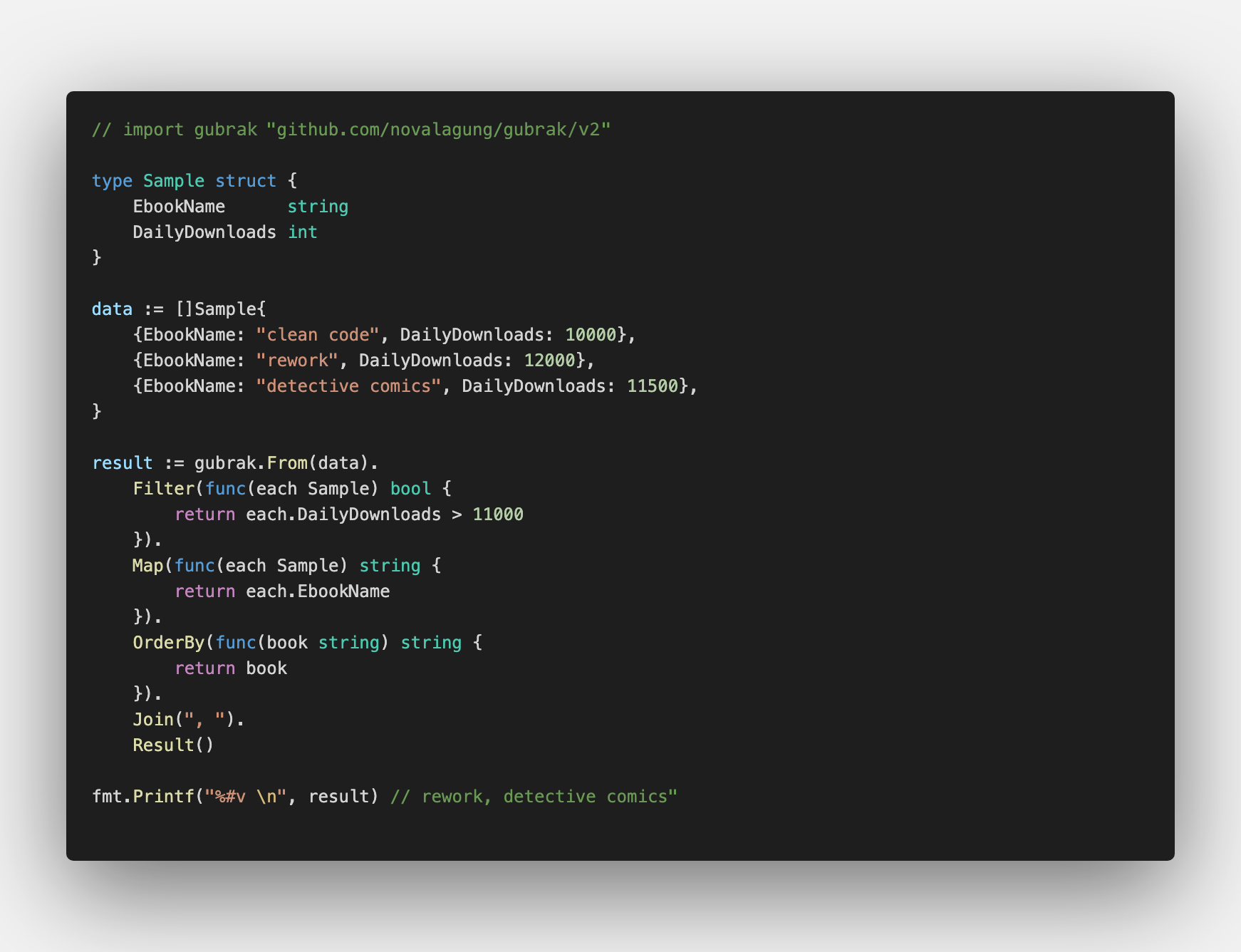 go get -u github.com/novalagung/gubrak/v2Below are the list of available functions on gubrak: