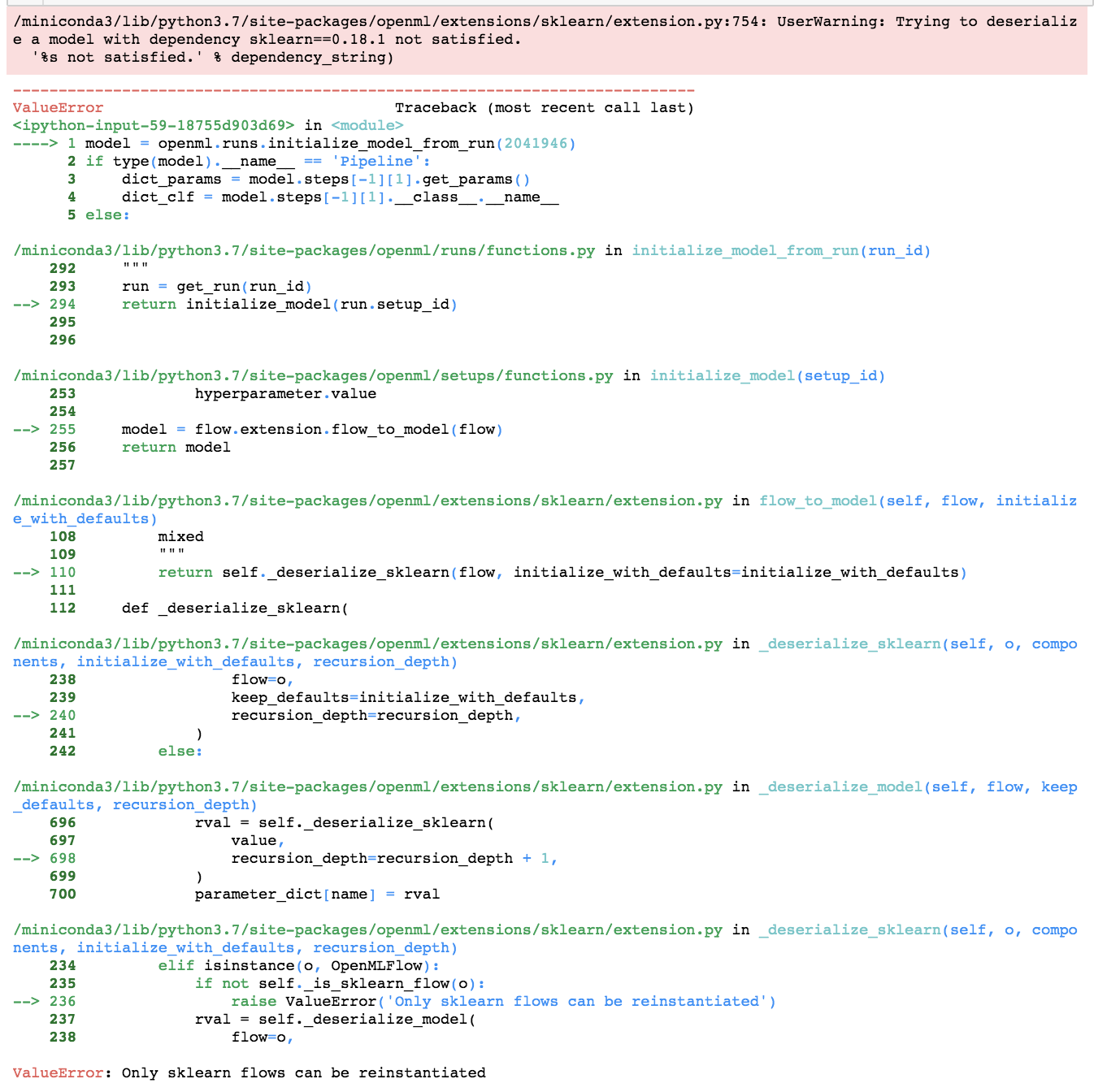 The flow downloaded in step 4 now has an external version attribute scikit-learn 0.X, but we used scikit-learn 0.X+1 in step 5. When uploading, we will reference the flow with the wrong scikit-learn version and therefore create faulty entries on OpenML. I'm wondering if such re-instantation is a) a good idea and b) if it is, how we can get around this issue? Maybe we need to remove the flow's own ID if we deserialize it to a different version? |