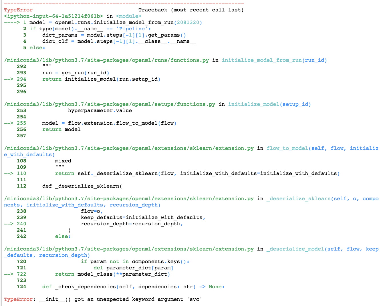 Oops, yes, I should have realized that. However, there is more: 'flow_name': 'sklearn.pipeline.Pipeline(standardscaler=sklearn.preprocessing.data.StandardScaler,svc=sklearn.svm.classes.SVC)(1)', I am not sure know where the words 'data' and 'classes' are coming from. As far as I know they are not part of the class hierarchy. Was this the case in older sklearn versions? |