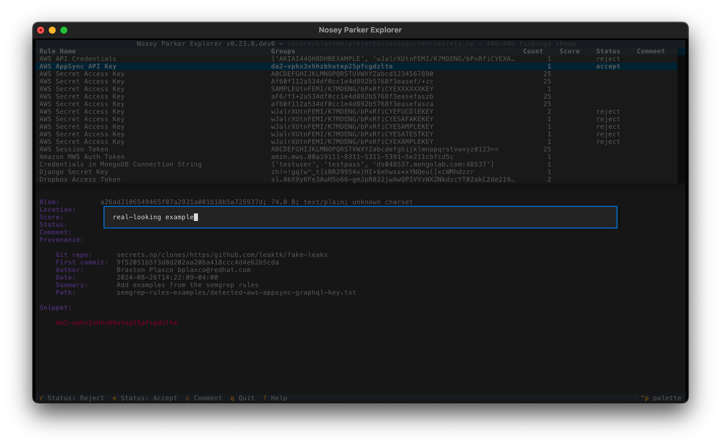 Nosey Parker Explorer is a TUI application for interactive review and annotation of findings from Nosey Parker, the secrets detector. It has been used on hundreds of offensive security engagements at Praetorian to quickly triage tens of thousands of findings.