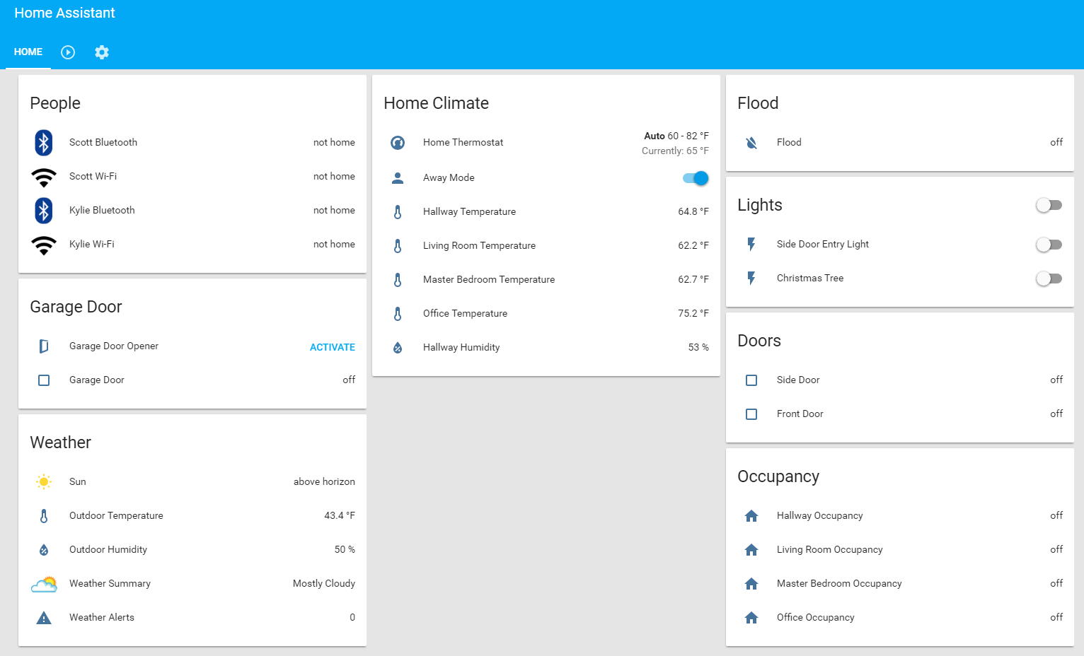 Scott's Home Assistant Configuration My Home Automation Devices Z-Wave: Z-Wave Controller: Aeon Labs Aeotec Z-Wave Z-Stick, Gen5 (ZW090) Garage Door: Ecolink Z-Wave Wireless Tilt Sensor - ECO-TILT-US GoControl Z-Wave Isolated Contact Fixture Module - FS20Z-1 Flood Sensor: Utilitech White Flood Sensor Door Sensors: Ecolink Z-Wave Door/Window Sensor Toggle Switch: GE Z-Wave Wireless Lighting Control Smart Toggle Switch, In-Wall, White, 12727 Smart Plug: Aeotec by Aeon Labs ZW096 Smart Switch, Small, White Wemo Mini Smart Plug Wi-Fi: Thermostat: ecobee3 Garage Door Relay Wiring Front End Screenshot